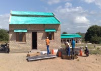 L’école a été construite par l’association des parents en 2009, avec 6 bâtiments fabriqués et montés en briques de terre compactée. De grandes ouvertures ont été faites pour favoriser l’éclairage et la ventilation. Les eaux de pluie sont récupérées dans 2 citernes pour les usages non alimentaires.